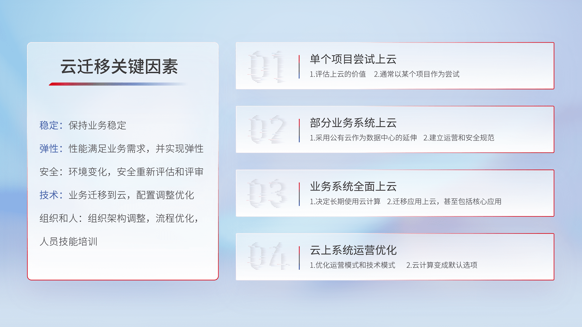结合实际业务,,从规划设计、、、、云平台选型、、云原生改造、、、、数据迁移、、集成交付,,迁移全过程为客户识别最佳上云路径,,,做好风险识别管理,,,,设计网络架构、、、身份权限、、安全审计合规、、、、操作审计、、、日志审计、、、、监控告警策略、、、多站点容灾设计等,,,,对云上基础设施进行整体规划,,,,提升IT治理水平,,,以满足弹性、、、、高可用、、、高性能的需求。。。