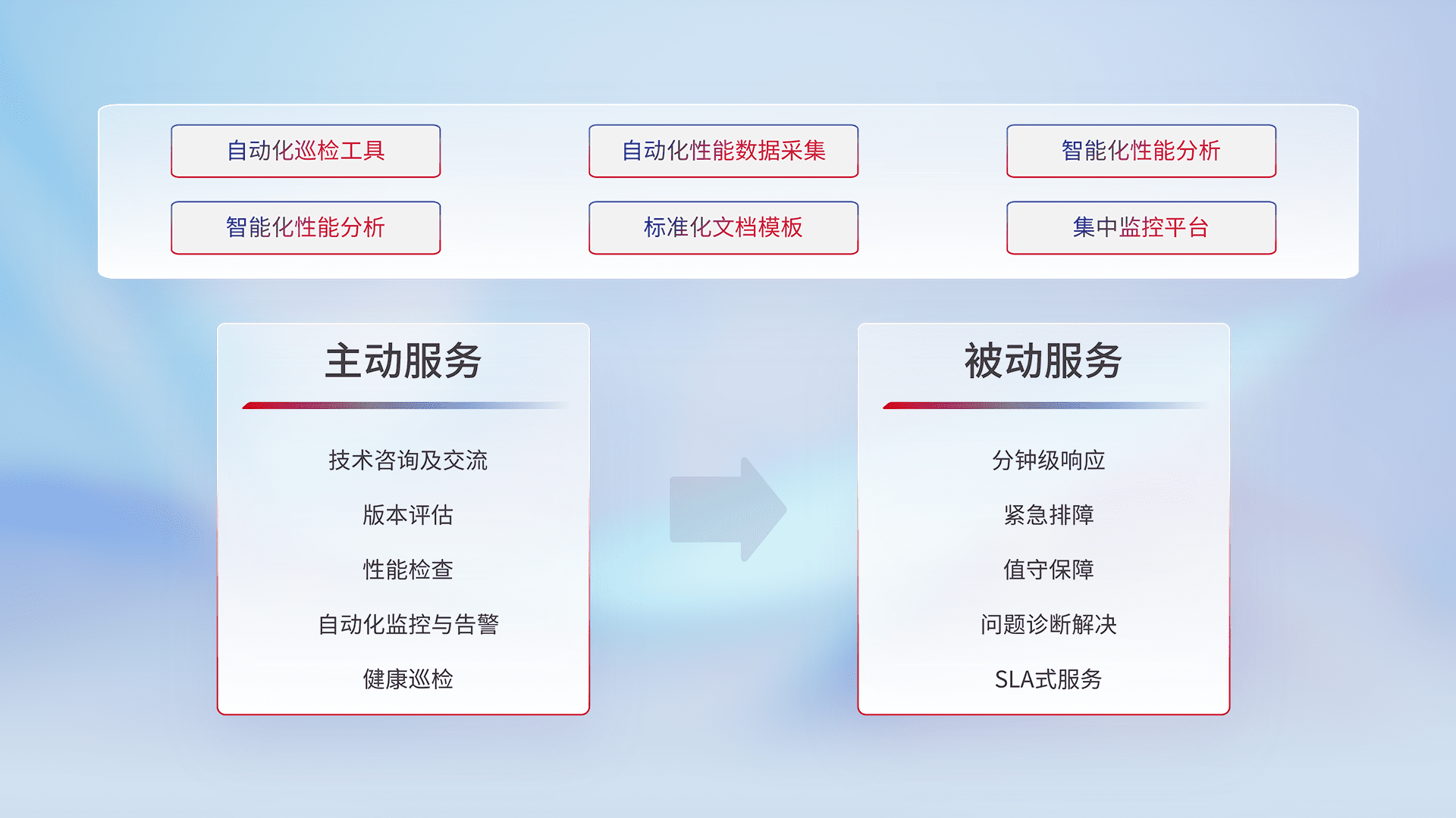 智能化工具和标准化文档,,,保障服务质量,,提供主动服务(包含技术咨询、、、、版本评估、、性能检查、、自动化监控与告警、、健康巡检)和被动服务包含(分钟级响应、、、紧急排障、、、、值守保障、、问题诊断解决、、、SLA服务)。。。。