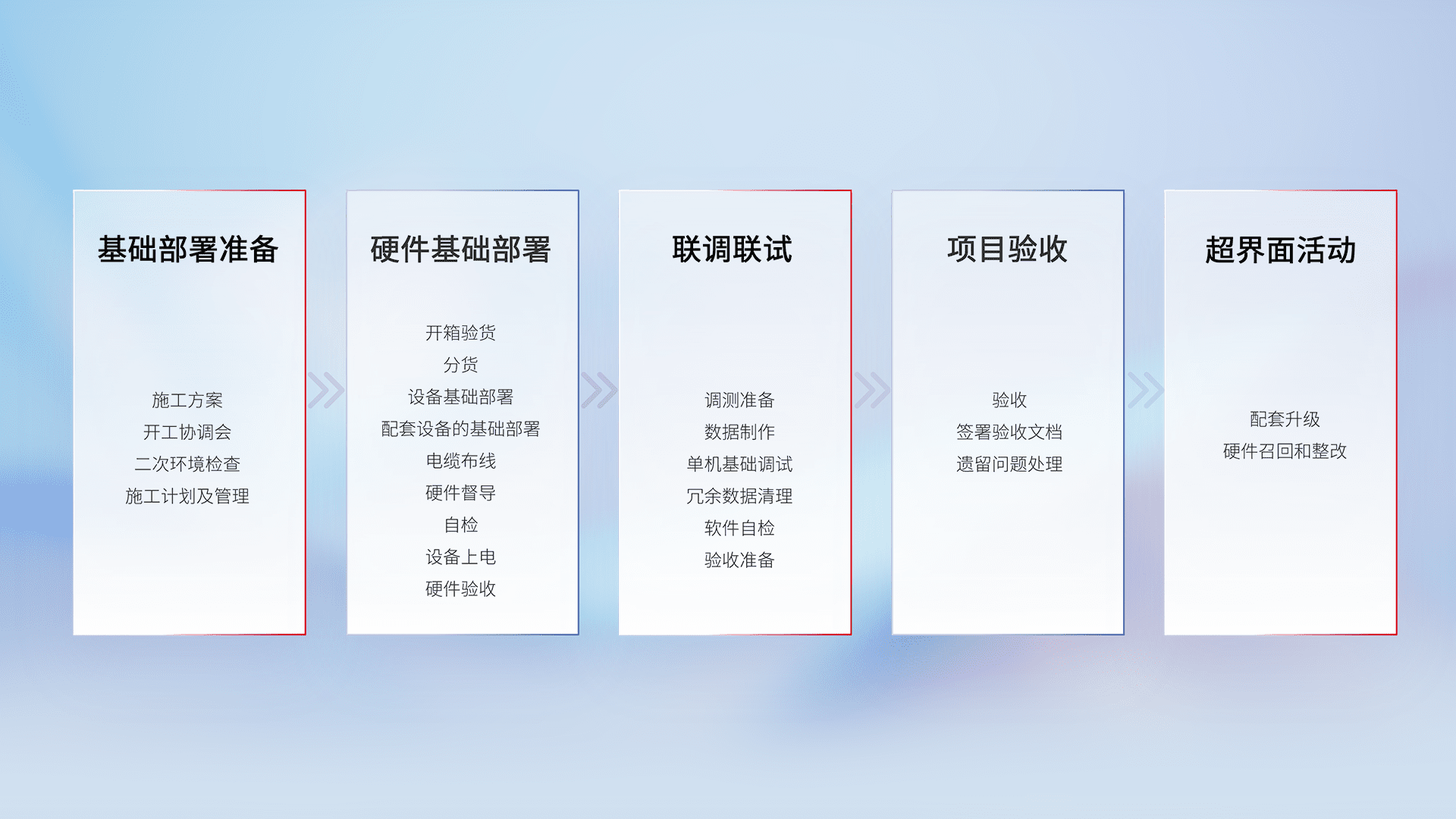 从基础部署准备、、硬件基础部署、、、联调联试、、、项目验收、、越界面活动的全过程可追溯,,保证施工质量和进度。。。。